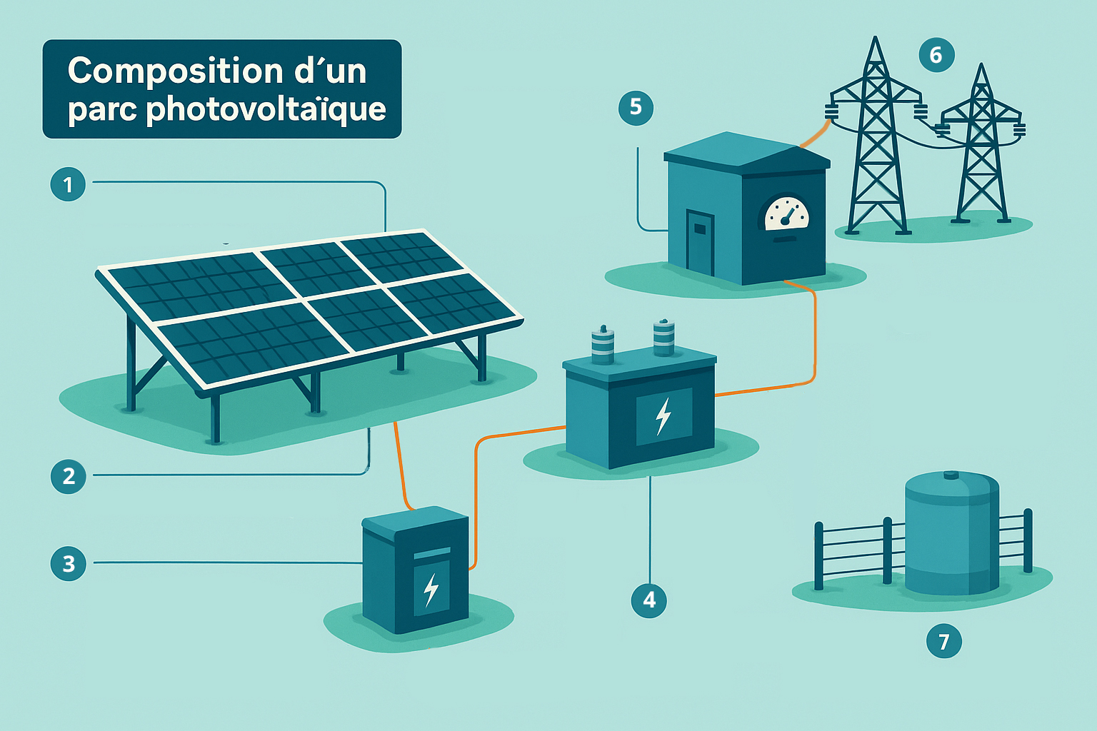 Pour produire de l’énergie, un parc photovoltaïque se compose de plusieurs éléments majeurs.