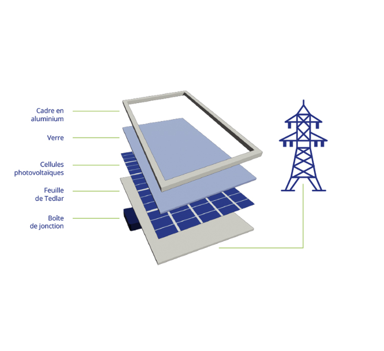 Un panneau photovoltaïque est composé de plusieurs modules montés sur une structure. Chaque panneau est constitué de plusieurs couches, dont les cellules photovoltaïques, qui contiennent des matériaux photosensibles. Lorsqu’elles sont au contact du rayonnement solaire, les électrons s’activent, et produisent de l’énergie. Cette énergie est ensuite redirigée vers le réseau électrique.